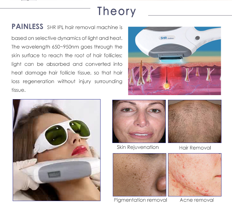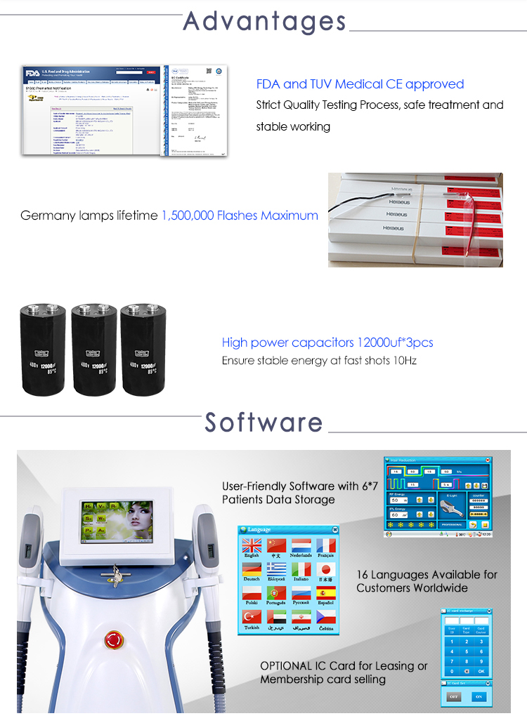 Toto je náš hot výprodejový stroj se 2 rukojeťmi, můžete si vybrat jinou konfiguraci podle svého požadavkuSHR Elight (standardní) IPL / SSR (volitelně) Jedna rukojeť je SHR( 15*50)( 650-950 nm pro super odstranění chloupků ), plus technologie In-motion, takže je to 10 snímků za sekundu, může dosáhnout rychlejšího odstranění chloupků, což znamená, že vám může výrazně ušetřit čas. Další je rukojeť E-light (15*35) s filtry (430/530/ 640-1200nm) pro odstranění akné, omlazení pleti, odstranění pigmentace, odstranění vrásek a žilek a tak dále. Rukojeť SSR, IPL je volitelná. Kromě toho má náš stroj certifikaci CE, ISO, prošel přísným klinickým testem v slavná klinika. Je tedy pro vaše klienty zcela bezpečný.