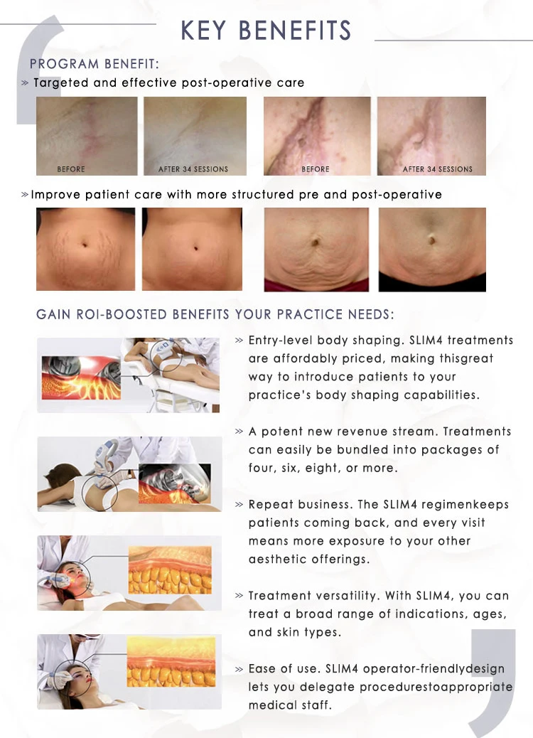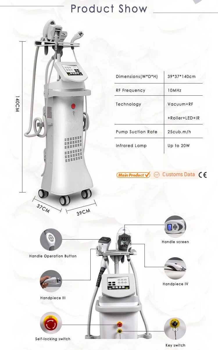 Použití: Hubnutí, zpevnění pokožky, redukce celulitidy, lifting obličeje Vlastnosti:1. Systém 5 v 1: Vakuový+ válec + RF + LED+IR2. 4 rukojeti pro ošetření celého těla 3. USA importované čerpadlo, silný výkon a dlouhá životnost 4.LCD obrazovka na násadci, inteligentní&pohodlné ovládání5. Bezplatné zobrazení LOGA na obrazovce6. ABS pouzdro, vhodné pro údržbu
